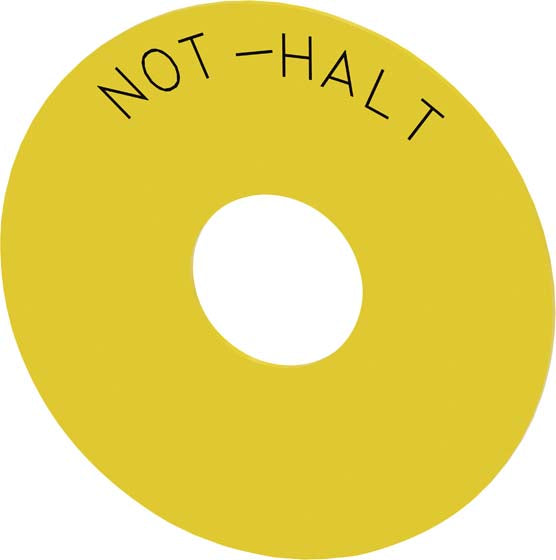 Das Unterlegschild dient als Beschriftung für Befehlsgeräte und weist auf die Not-Aus-Funktion hin.