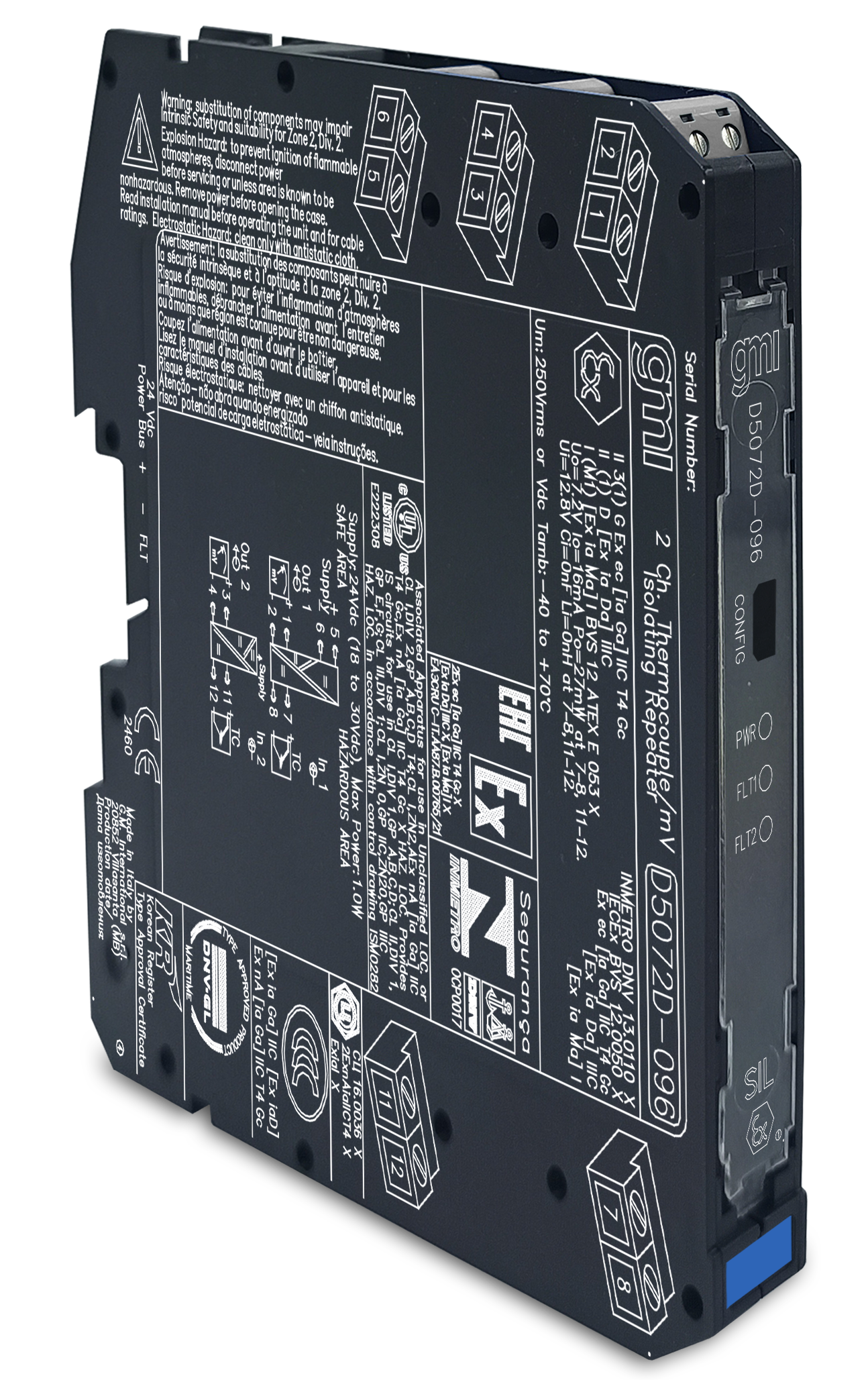 Der Thermoelement-/mV-Repeater D5072-096 empfängt ein niedriges Gleichspannungssignal von einem Millivolt- oder Thermoelementsensor im explosionsgefährdeten Bereich und leitet es isoliert in einen sicheren Bereich weiter. Er eignet sich fßr Anwendungen, die die Sicherheitsstufe SIL 2 in sicherheitsrelevanten Systemen fßr Hochrisikobranchen erfordern. Das Modul D5072D-096 verfßgt ßber eine Duplikatorfunktion, die aus einem einzigen Eingang zwei unabhängige Ausgänge erzeugt.