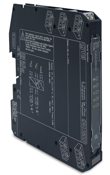 Der Schalter-/Näherungsdetektor-Repeater D6038 ist ein Modul, das sich für Anwendungen mit SIL-3-Anforderungen in sicherheitsrelevanten Systemen für Hochrisikobranchen eignet. Das Modul kann für Schalter oder Näherungsdetektoren konfiguriert werden und gibt den Eingangszustand am Ausgang wieder. Der Ausgang kann zwei verschiedene Impedanzwerte (RL oder RH) annehmen oder vollständig offen sein. Der Modulausgang gibt den Eingangszustand gemäß folgender Zuordnung wieder: niedriger Eingangszustand -> RL, hoher Eingangszustand -> RH. Alternativ kann der Ausgang so konfiguriert werden, dass er den Eingangszustand invertiert. In beiden Fällen öffnet der Ausgang, sobald ein Fehler (Unterbrechung oder Kurzschluss) am entsprechenden Eingang auftritt.